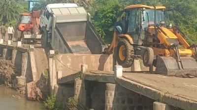रेत भरे ट्रक का भार नहीं झेल पाया पुल, छतरपुर में ढहा पुल — बाल-बाल बचे लोग