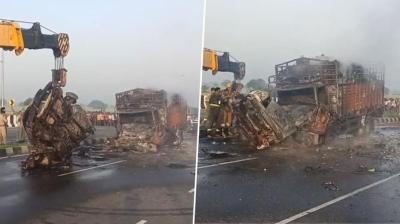 चंद सेकंड में मौत का मंजर: कैंटर से टकराई कार बनी आग का गोला, यात्रियों को नहीं मिला बचने का मौका