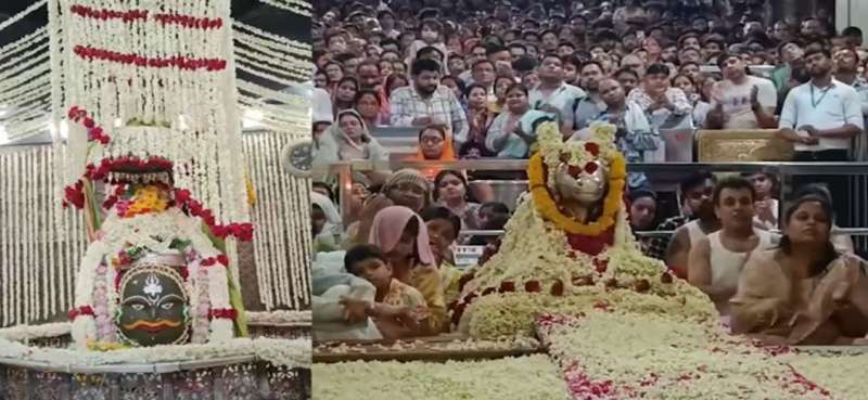 विश्व प्रसिद्ध बाबा महाकाल के दरबार में रोजाना लाखों श्रद्धालुओं आते हैं। कई भक्त भगवान महाकाल से मनोकामना मांगते हैं। आज भी जयपुर से आए शेखर अग्रवाल द्वारा महाकालेश्वर मंदिर के गर्भगृह से लेकर नंदी मंडपम तक मोगरे के फूलों से आकर्षक सजावट की गईं। श्रद्धालु शेखर अग्रवाल ने बताया कि वह बाबा महाकाल का दरबार पिछले 13 साल से ऐसे ही सजाते हुए आ रहे हैं। यह उनका 13वां साल है। आज बाबा महाकाल का मनमोहक शृंगार किया गया।