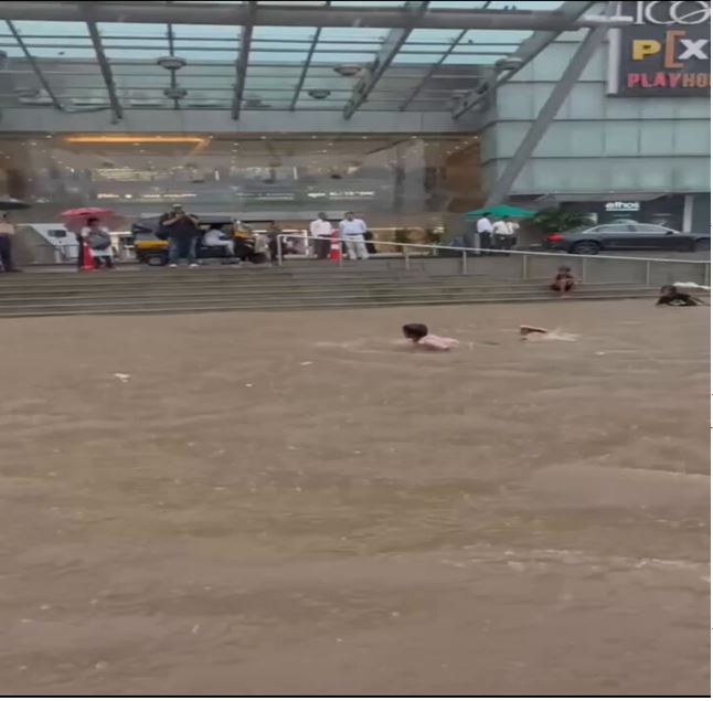 मुंबई : महाराष्ट्र में बहुत बारिश हो रही है। मुंबई का हाल बेहाल हो गया है। शहर में बाढ़ की तस्वीरों और वीडियो को इंटरनेट पर बाढ़ आई है। लोग मुंबई बारिश के बाद हुए हाल को लेकर चर्चा कर रहे हैं। बीएमसी के दावों की पोल खुल गई है। इसी बीच गोरेगांव ओबेरॉय मॉल का एक वीडियो सामने आया है। मॉल के चारों तरफ पानी भरी है। कुछ लोग इसमें तैर रहे हैं। देखने में लग रहा है कि मानो यह वॉटर पार्क हो।