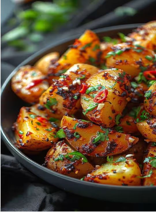 - आपका स्वादिष्ट चिली गार्लिक पोटैटो तैयार है। इसे हरे धनिया से गार्निश करके गरमागरम परोसें।